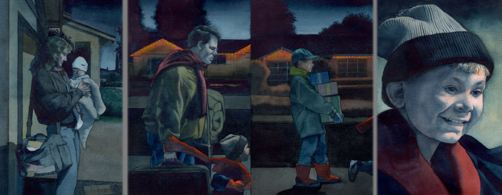 All the photo reference for the panels were shot at different times and places which led to some funny situations. The third from left, the "older brother", is my friend's son, Robbie Carter, who bravely dressed up in winter clothes and posed in the middle of suburbia in 100 degree, mid-June, heat. (Robbie was also the model for the boy in my other book The Prince of Butterflies.)