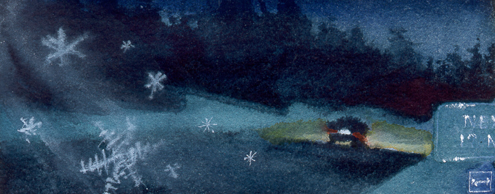 One of the early paintings finished for the book. I still don't like how the snowflakes turned out unfortunately. Overall though, I like how the lighting feels a lot like moonlit roads in snow country. This image was a bit harrowing to shoot reference for. I found a very deserted country road (it might have been a long private driveway, I'm not sure) just south of Truckee, California. I parked my car---lights on---in the road (being very careful not to lock my keys in the car at 2am miles from anywhere.) and ran 60 yards back down the road, set up a tripod and camera by the side of the road in sub-freezing weather, and shot 10-30 second exposures by moonlight---hoping I would get something usable.