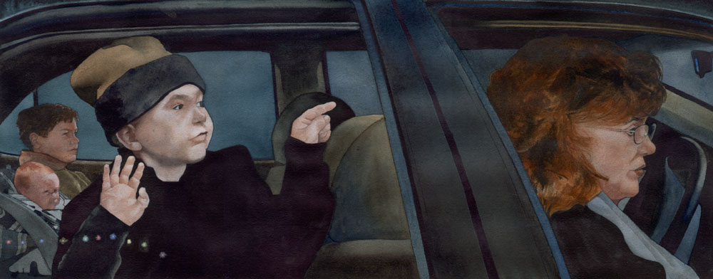 Technically, this was a difficult painting. All the models were photographed at different times and places except the mother and boy, and even with them, the reference was from different photographs so the car had to be "constructed" visually, based on reference from many angles---this isn't how you normally want to approach something like this!