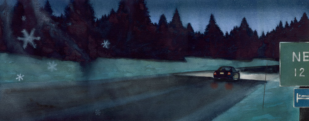One of the early paintings finished for the book.  I still don't like how the snowflakes turned out unfortunately.  Overall though, I like how the lighting feels a lot like moonlit roads in snow country.  This image was a bit harrowing to shoot reference for.  I found a very deserted country road (it might have been a long private driveway, I'm not sure) just south of Truckee, California. I parked my car---lights on---in the road (being very careful not to lock my keys in the car at 2am miles from anywhere.) and ran 60 yards back down the road, set up a tripod and camera by the side of the road in sub-freezing weather, and shot 10-30 second exposures by moonlight---hoping I would get something usable.