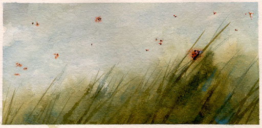 overhead (the endpapers), passing a ladybug, (the title spread), then