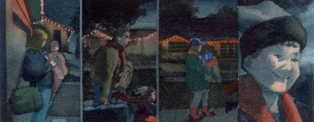 All the photo reference for the panels were shot at different times and places which led to some funny situations. The third from left, the "older brother", is my friend's son, Robbie Carter, who bravely dressed up in winter clothes and posed in the middle of suburbia in 100 degree, mid-June, heat. (Robbie was also the model for the boy in my other book The Prince of Butterflies.)