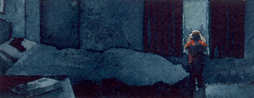 I like how this painting ended up, and I think it's partially due to the very low expectations I had for it! A darkened, monochromatic room, a single standing figure silhouetted, I thought it was going to be a boring painting. The process of painting it turned out to be a lot more dramatic than I thought.