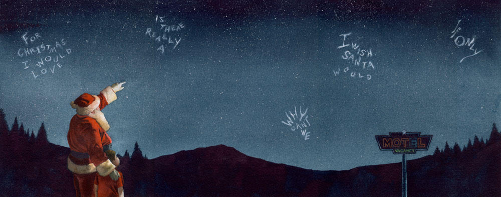 One thing I do love about this painting is the figures of Santa and the boy. I like the way the red suit pops off the page against the deep indigo blues.