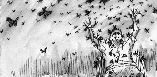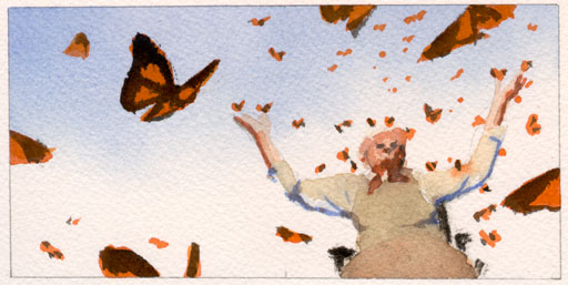 Sketch From the very beginning, I wanted to echo the composition of the Butterfly Man painting, but make it more joyful like the Cover painting.