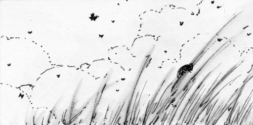 overhead (the endpapers), passing a ladybug, (the title spread), then