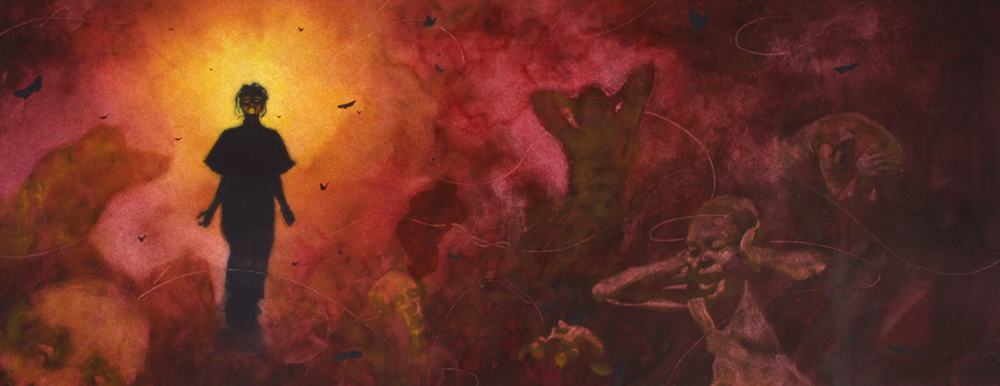 Probably the image in the book with the most involved backstory. Unknowingly, I was working on an older version of the manuscript, some sections of which had changed in small, but significant ways. This spread, where Shining "sings" for the first time, was originally quite ominous, and was revised to where it had a lighter touch, more a sense of wonderment than fear. Of course, none of these discrepancies were noticed until the last minute, when we were facing press deadlines, and the designer, editor, writer, and I had to make some quick adjustments to make the image fit better with the text as written.