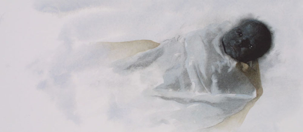 This was an experience. In the text, Julius wrote that the baby was born with jet-black skin (dark skin pigmentation normally develops later) and looked into the mother's soul "as if she knows my past and my future." First of all, it's always difficult to live up to a line like that! Secondly, you have a painting of a baby that has to feel a little otherworldly. It's like trying to paint an evil teddy bear without really changing anything about it.